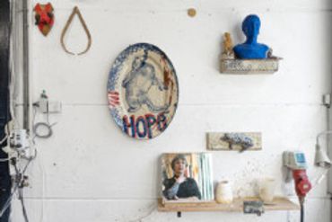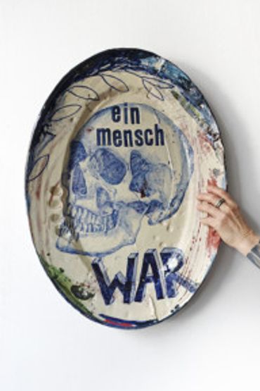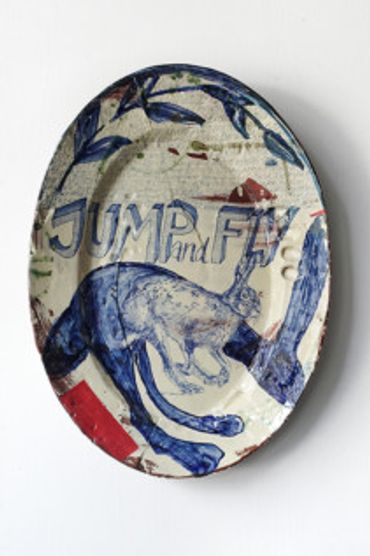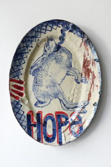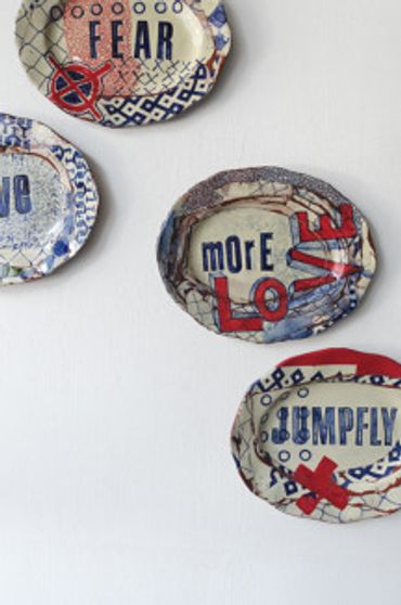 Rita De Nigris aime confronter les codes traditionnels de la céramique aux codes d’une narration contemporaine où mots et images tiennent davantage du pictogramme. Avec Paroles à la douzaine, elle nous propose une œuvre critique de la société à la fois subtile et évidente, émaillée de clins d’œil ironiques.