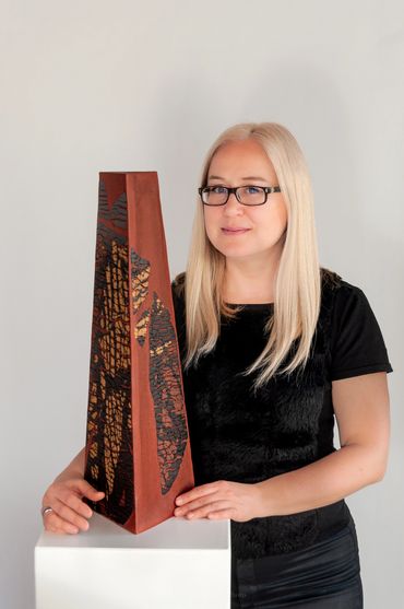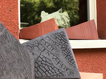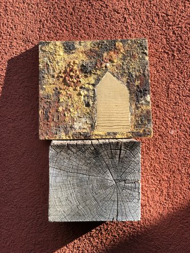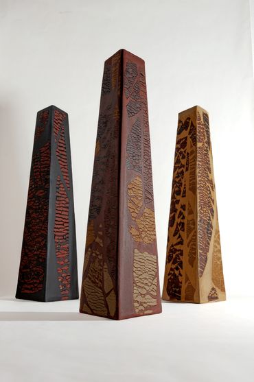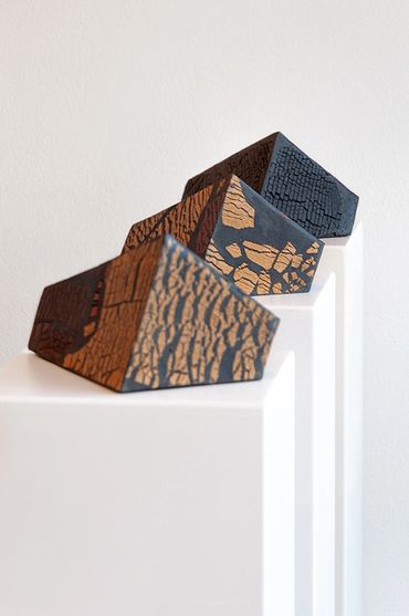 The artist creates abstract and architectural shapes which integrate clay fragments through a slow, determined and yet humble process. Her pieces evoke in a metaphorical way the alchemical processes of the psyche, the transmutation of each individual who, despite bearing the burden of ordeals which have been solidified by the fire of life, becomes a new unique being.